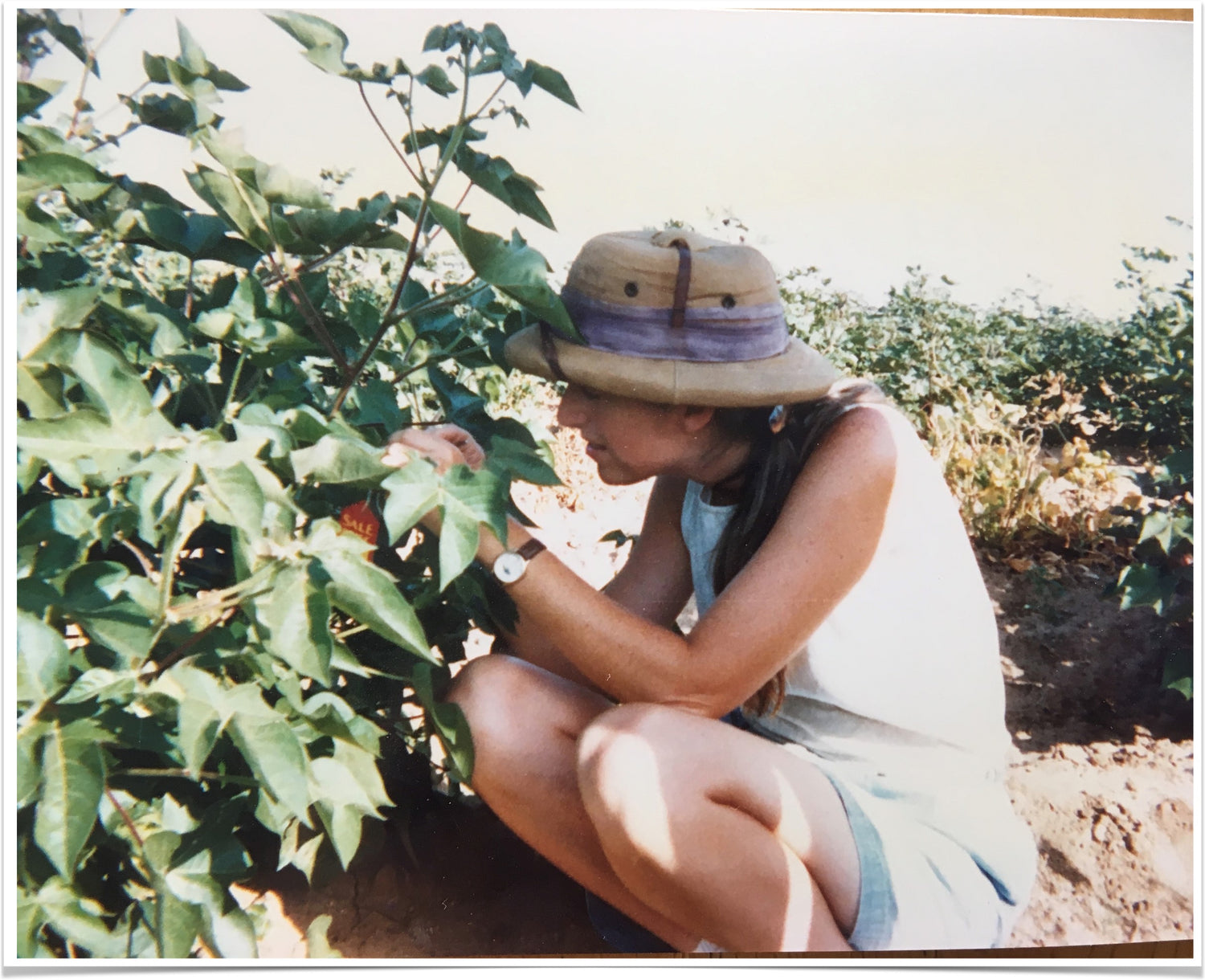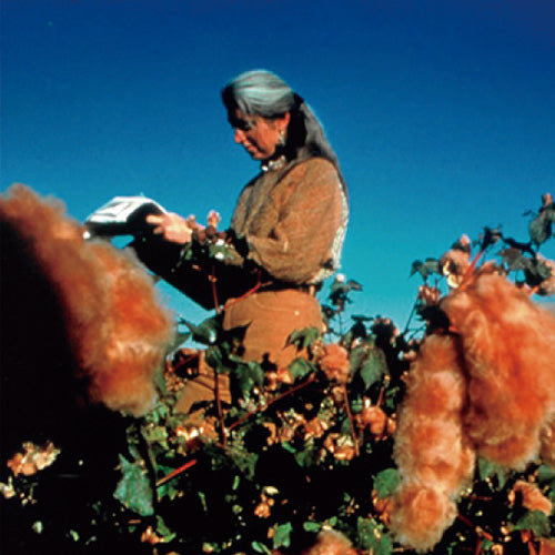 生物・昆虫学者であるサリーフォックス女史、彼女は古代の原綿である茶綿に出会い、オーガニック農法によるカラードコットンを開発。誰もが糸にするのは不可能だと思っていた古代の綿を紡績できるまで育て上げたコットンのパイオニアです。きっかけは知り合いの娘さんが、学校でテキスタイル染色を学んでいた時、手袋をしなかった為、皮膚から染色液の成分が体に入り、脳障害に陥ってしまった事からでした。自身で調べているうちに、その染色液と殺虫剤(農薬)が同じ会社で作られていることがわかり、以降は染色された糸を避け、本格的にオーガニックコットンの栽培を始めます。また大豆につくテントウムシが綿花につく害虫を食べてくれるという自然のサイクルを活かし大豆と綿花を交互に植えるなどして無農薬栽培をおこなっています。今もカリフォルニアのナパバレーの近くの農場で綿花だけでなく、羊を飼い、オーガニック野菜などの農作物を栽培しています。